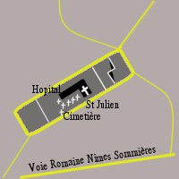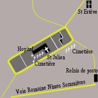 Début du 1er millénaire.On rencontre un habitat dispersé le long du Rhôny Epoque médiévale.L'existence de la voie romaine, sur le plateau sud de la dépression de la Vaunage, attire les habitants vers le bas de la colline, ils profitent ainsi de la plaine pour de petites cultures céréalières, de la garrigue pour l'élevage des ovins et ont un accès vers Nîmes. La vie s'organise autour de l'église Saint Julien, présence attestée en 1149, et de ses dépendances: presbytère, hôpital et cimetière. Le village se présente alors comme un rectangle étroit, entouré de rues, rue Haute et rue Basse actuelles. La dernière maison à l'est se trouve à hauteur de la place du Visago actuel et la dernière à l'ouest borde la rue des Chasselas actuelle. Les rues sont renforcées de murs en pierre pour assurer la protection des habitants |